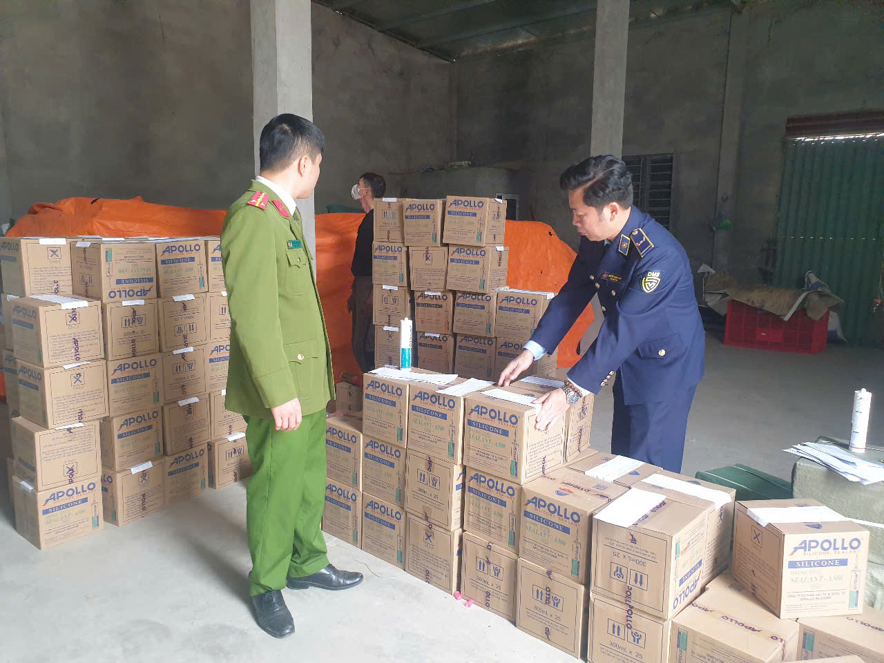 Kết quả khám phát hiện trong kho có 2.400 chai keo Apollo Silicone các loại có dấu hiệu là hàng hóa giả mạo nhãn hàng hóa, bao bì hàng hóa gồm: 1.350 chai keo Apollo Silicone loại A500 (300ml), màu trắng sữa; 150 chai keo Apollo Silicone loại loại A200 (300ml), màu trắng trong; 900 chai keo Apollo Silicone loại A500 (300ml), màu đen).
