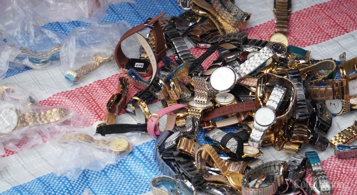 Đây là số tang vật, phương tiện không có hóa đơn chứng từ chứng minh nguồn gốc bị cơ quan chức năng tịch thu để xác minh, làm rõ sau khi kiểm tra các cơ sở kinh doanh trong vòng 3 năm qua. Gồm quần áo, túi xách, nón giả mạo; điện thoại, đồng hồ, mỹ phẩm, đồ điện tử,... Tổng giá trị hàng hóa vi phạm bị tiêu hủy gần 1,2 tỷ đồng.